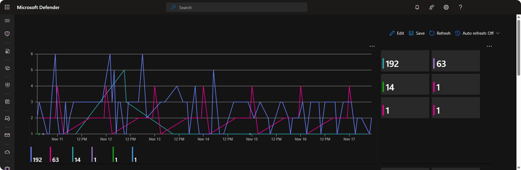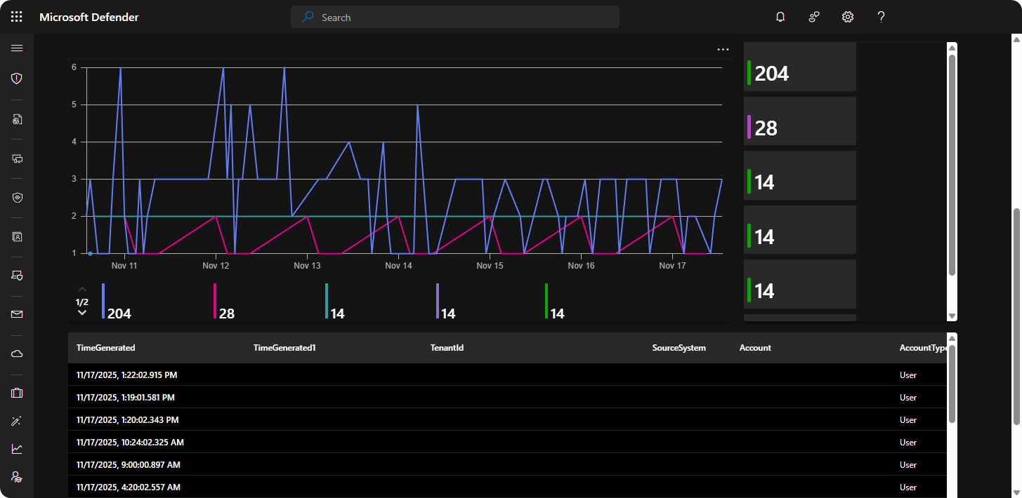 We can monitor failed logon attempts to domain admin accounts through the SecurityEvents table. This allows us to create timechart and tiles to better highlight the total failed logon attempts and patterns. Here’s KQL queries to implement the timechart and tiles.