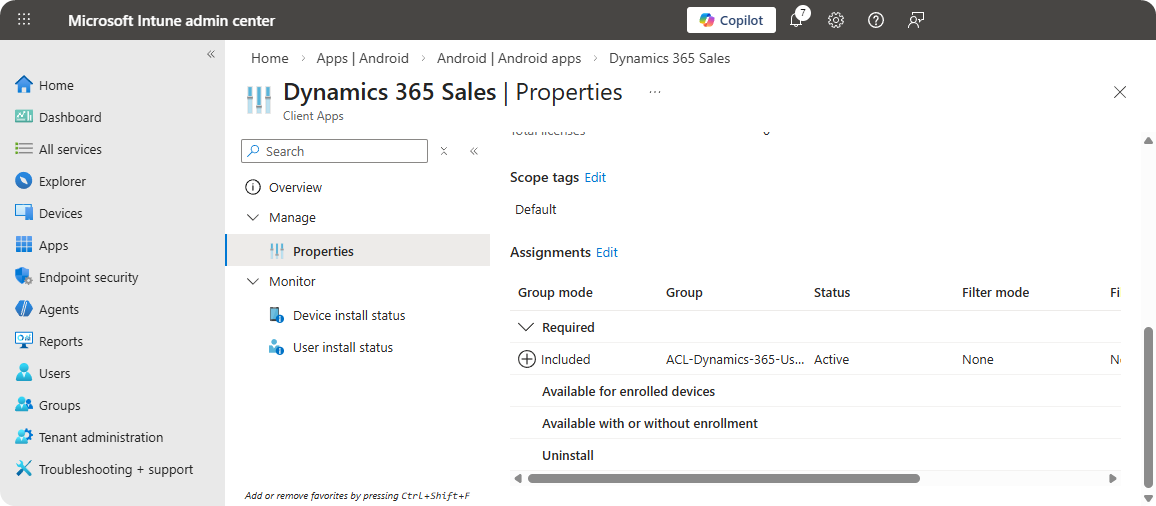 The Microsoft Dynamics 365 Sales application will be installed on all the users/endpoints that is inside of the security group ACL-Dynamics365-Users within 8 hour time-frame. I would recommend setting it up so it’s available at Company Portal marketplace instead of requiring the application to be installed on their endpoints.