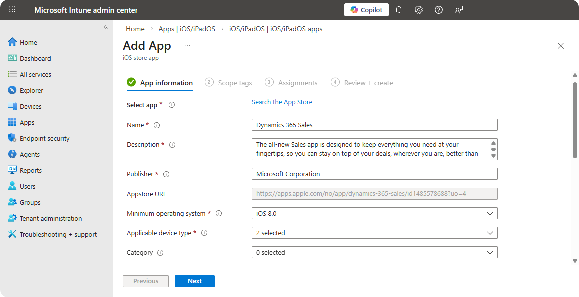 The reason a application profile has to be deployed in order for Sales Team to access Micrsofot Dynamics 365 Sales is because our Microsoft Intune configuration requires all applications that are accessed with company account to be managed by us. It’s fairly easy to deploy Microsoft Dynamics 365 Sales application profile as you can see.