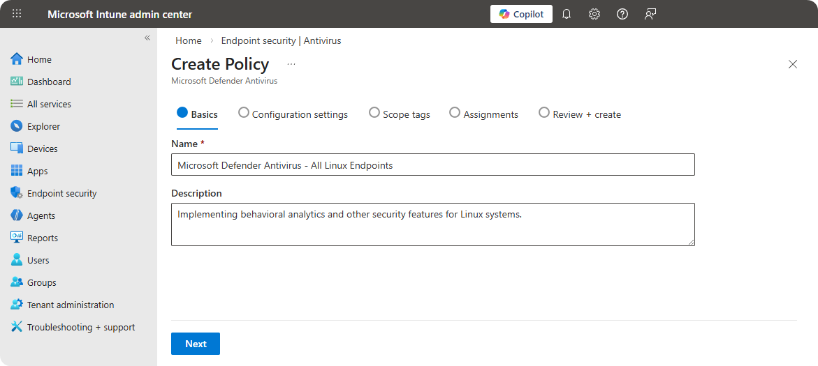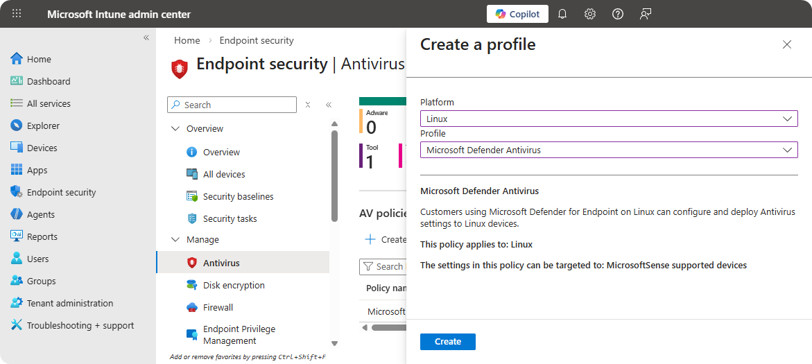 Click on Create and select Linux as Platform and Profile as Microsoft Defender Antivirus.