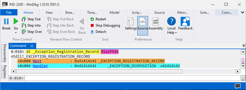 The Thread Environment Block (TEB) structure has a pointer named ExceptionList which points to the structure _Exception_Registration_Record. The _Exception_Registration_Record structure is extremely important for SEH overflow since it contains two pointers Next and Handler which will be overwritten during exploit development process. Here is an overview of accessing TEB and _Exception_Registration_Record inside WinDBG.