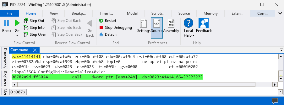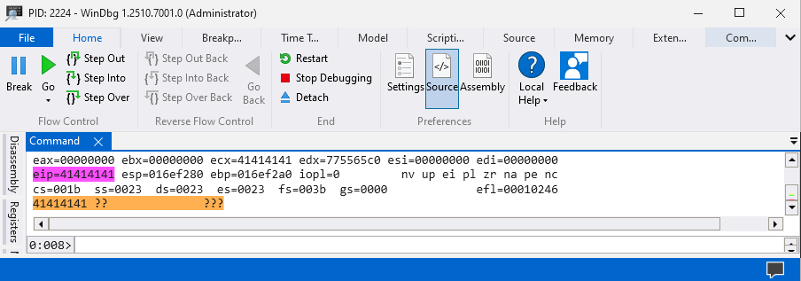 The EAX register value is 0x41414141 which is a strong indication that the fuzzer managed to SEH overflow the application. We can continue running the application using the g command and the EIP register should be overwritten with 0x41414141 which will crash the application.
