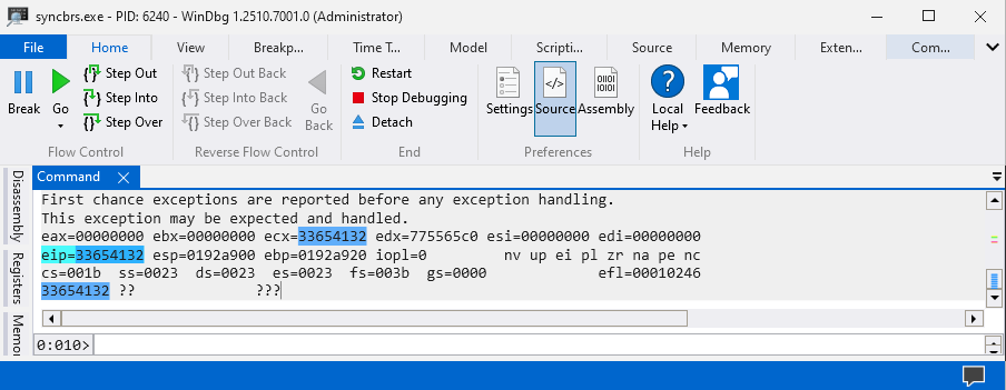 main()Attach WinDbg to the Sync breeze Enterprise v10.14.18 (syncbrs.exe) application and execute the exploit.py script against the system and the application should crash automatically.