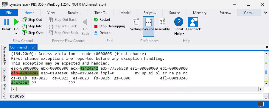[*] Exact match at offset 128Now as we know the offset to control the SEH Handler address is 128 bytes the exploit.py script can be modified to send 128 bytes of padding data and then the data which will overwrite the SEH Handler. I’ll be sending 128 bytes of \x41 character and then \x42\x42\x42\x42 which will overwrite SEH Handler with 0x42424242. We can now attach WinDbg to syncbrs.exe again and execute the modified exploit.py script.