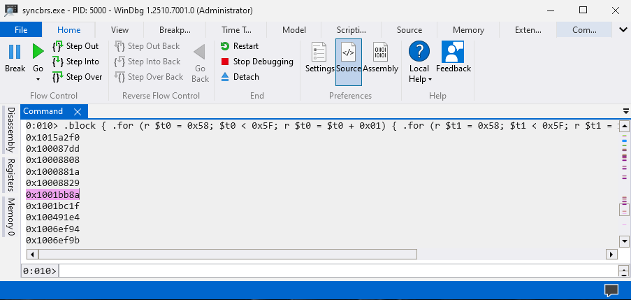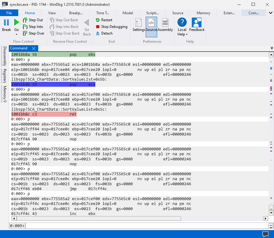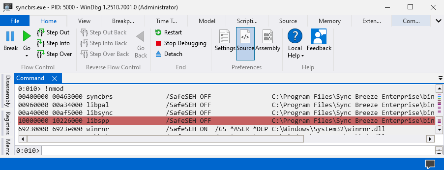 I’ll be using the libspp library since it ranges from 0x10000000 to 0x10226000 which means it won’t consists bad characters such as 0x00 which will crash syncbrs.exe process. Here is the WinDbg script that will allow us to search for POP, POP, RET instructions.